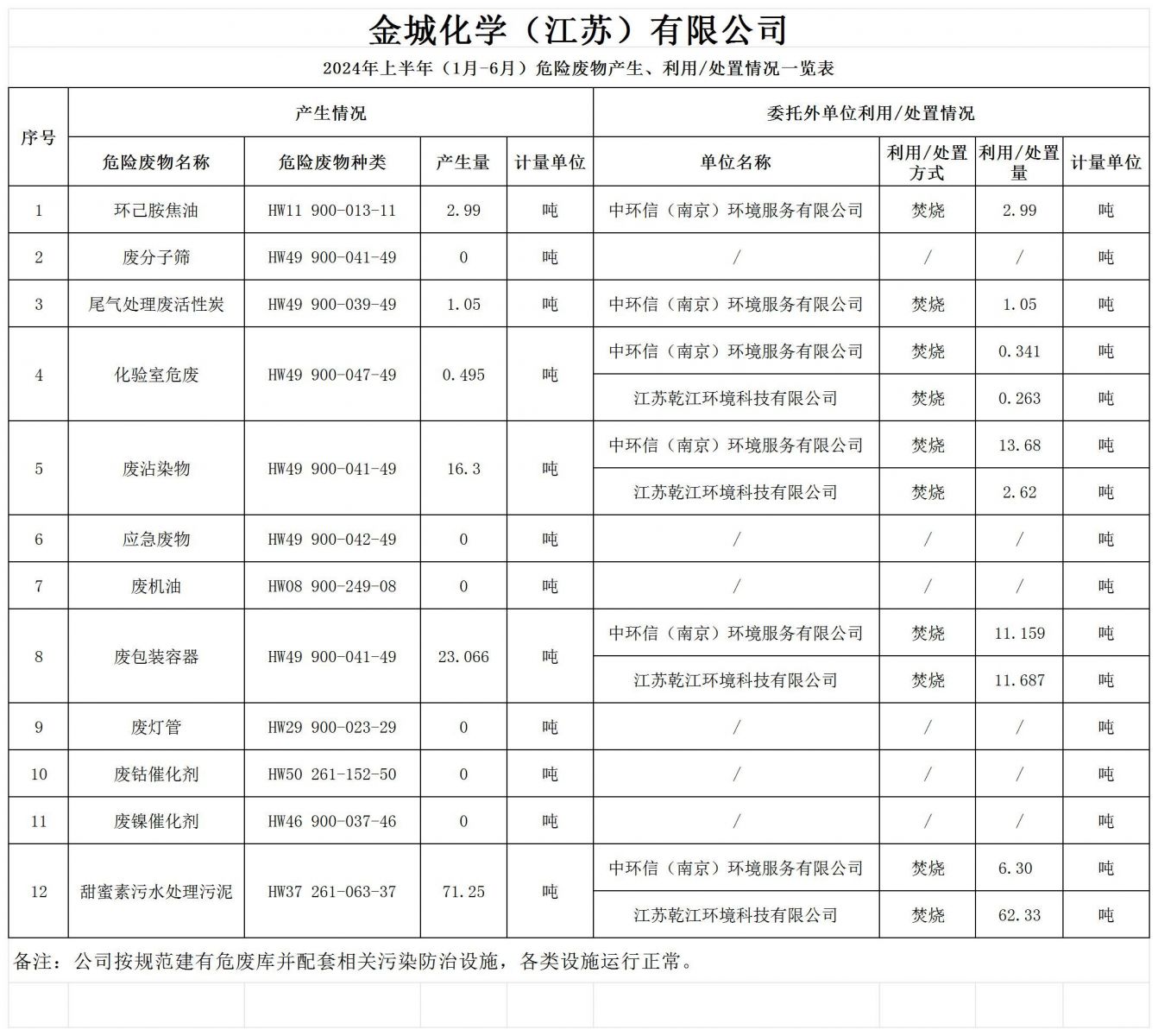 金城化學(xué)(江蘇)有限公司2024年上半年(1月-6月)危險(xiǎn)危物產(chǎn)生、利用/處置情況一覽表